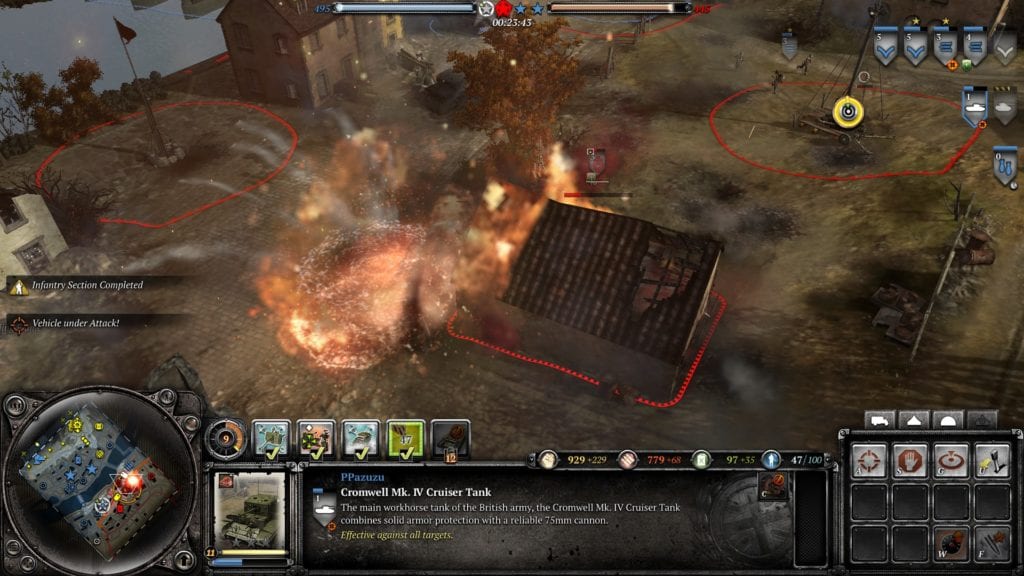 The British Forces feel as though they can loosely be defined by the either-or ‘Hammer’ and ‘Anvil’ tactical options which can eventually be unlocked from the tank-constructing Company Command Post building. As the names suggest, these respectively expand the firepower and durability of the faction by opening up new units (a tank on each branch) and unit abilities; things like tanks with ‘war speed’ on the Hammer branch, and quicker engineer repairs under Anvil.