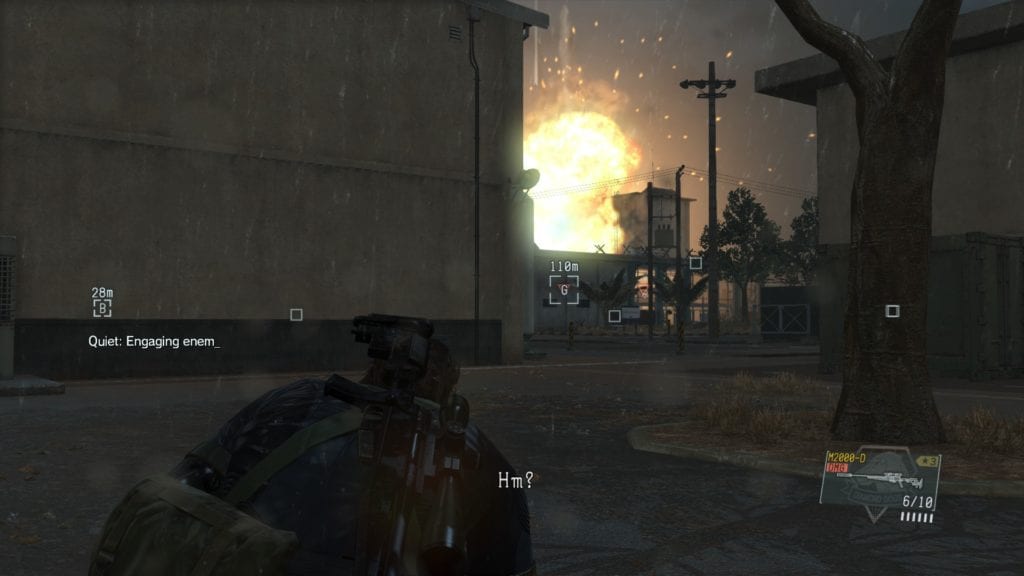 Oddly enough, Quiet – generally referred to as “that bikini sniper girl” or “the one with the tits” online – has one of the more understated and sympathetic storylines and character arcs, so it’s a bit of a shame that she’s almost entirely a reactive character rather than one who pushes the story forward (and that the excuse for her clothing is as laughably flimsy as the clothing itself, but let’s not get into that). Nonetheless, if the early trailers left you expecting something as verbose and emotional as earlier titles, you’re going to be sorely disappointed: there is very, very little of that here.