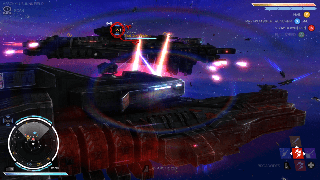 Actually, it would be more accurate to say that your own craft’s motion is restricted to 2D. Objects appear above and below you in the world, and smaller ships like fighters will buzz around your vessel (and can be shot down with turrets, aimed in full 3D), but this is very much not a space title that will demand a flight sim-esque desk set-up. The emphasis is on simplicity and, in combat, on naval-style broadsides.