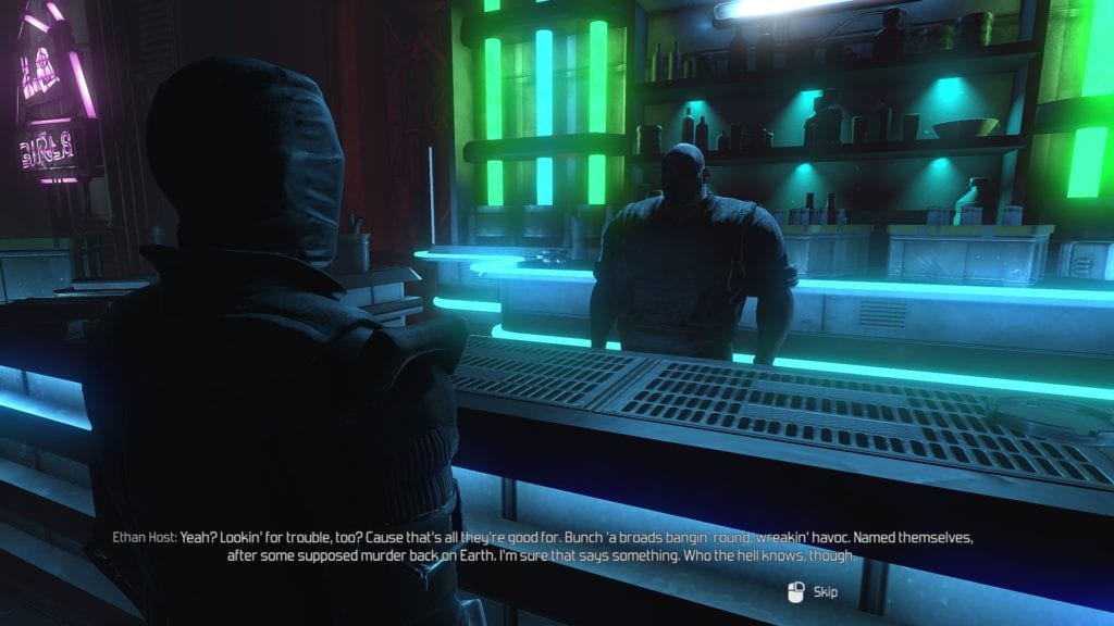 The lighting generally adds a lot to the atmosphere, although this dingy club is a bit sparsely populated. And is one of the only places on Mars with knowledge of the colours blue, green, and purple.